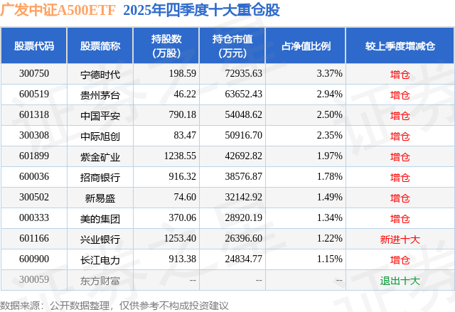 从基金限度来看,广发中证A500ETF基金2025年四季度公布的基金限度为216.25亿元,较上一期限度170.81亿元变化了45.44亿元,环比变化了26.61%。该基金最新一期钞票建立为:股票占净值比99.24%,无债券类钞票,现款占净值比1.42%。从基金握仓来看,该基金当季前十大股票仓位达20.11%,第一大重仓股为宁德期间(300750),握仓占比为3.37%。